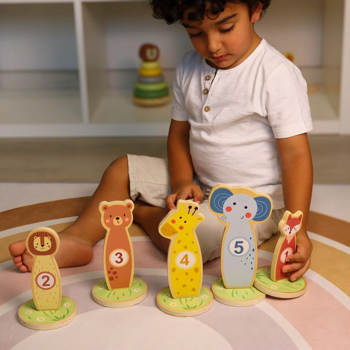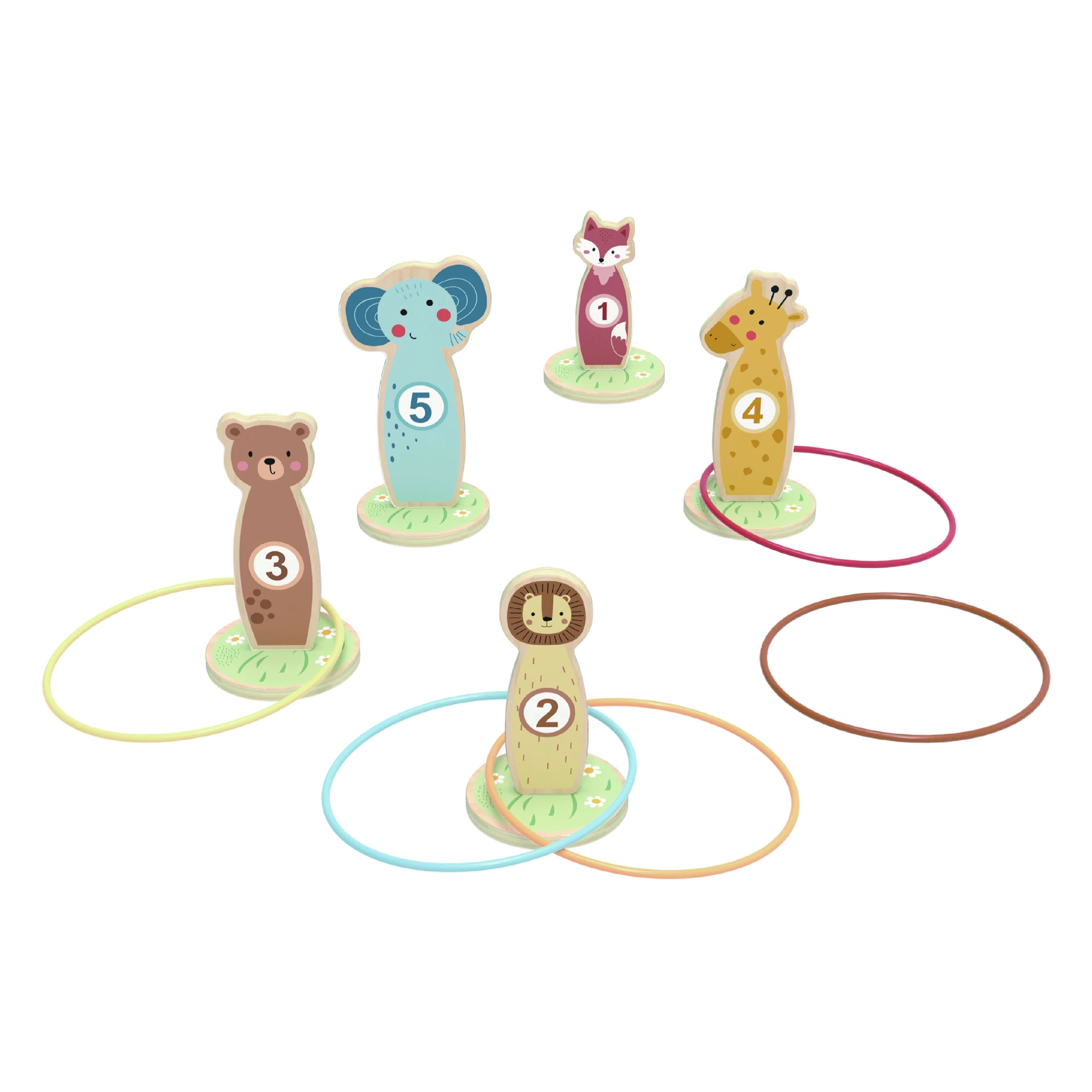 This wooden Ring Toss set features five cheerful animal pegs and colorful rings, offering endless fun while encouraging kids to aim, toss, and enjoy playful challenges.