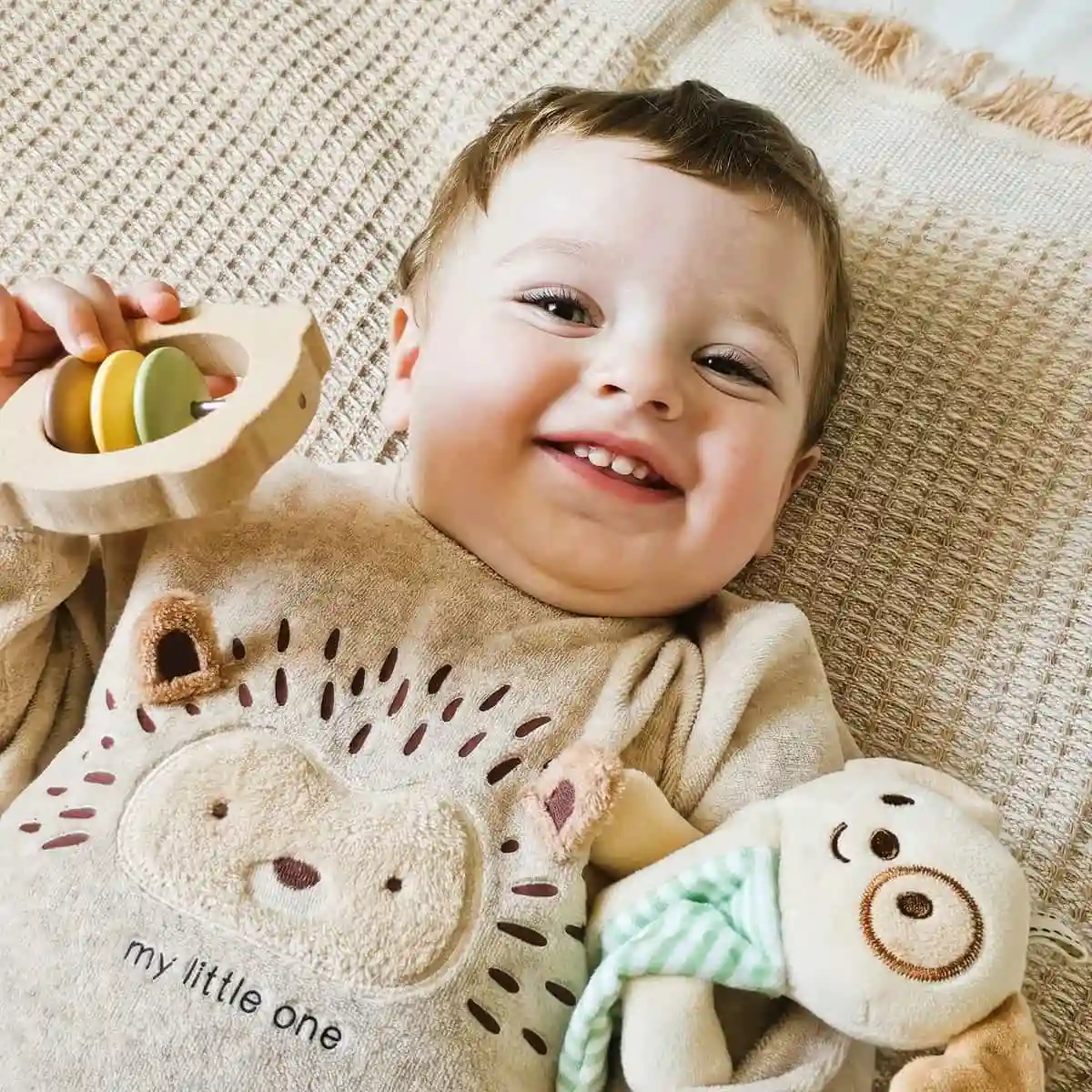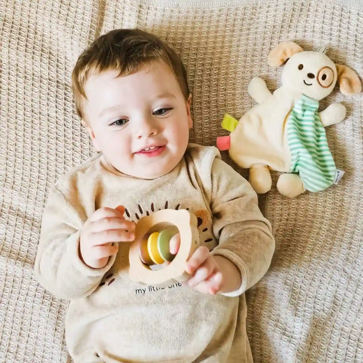 Our Baby Comfort Toy - Dog is a delightful companion for infants aged 6 months and older, designed with love and care for little hands. This adorable puppy set includes a soft, cuddly plush toy, a charming wooden rattle with beads, and a teething grip toy—all made from sustainable wood and safe materials that meet the highest standards of quality and safety. The gentle textures and engaging shapes encourage sensory exploration, while the wooden elements provide tactile stimulation for developing motor skills.