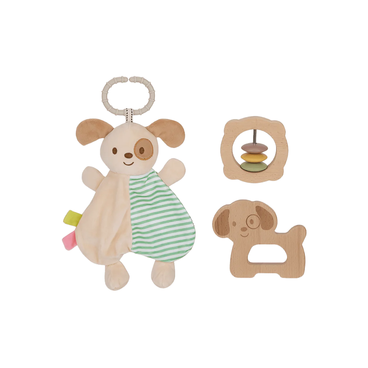 The Baby Comfort Toy – Dog includes a cuddly plush puppy, a wooden rattle with beads for auditory fun, and a teething grip toy, promoting motor skills, sensory exploration, and brain development.